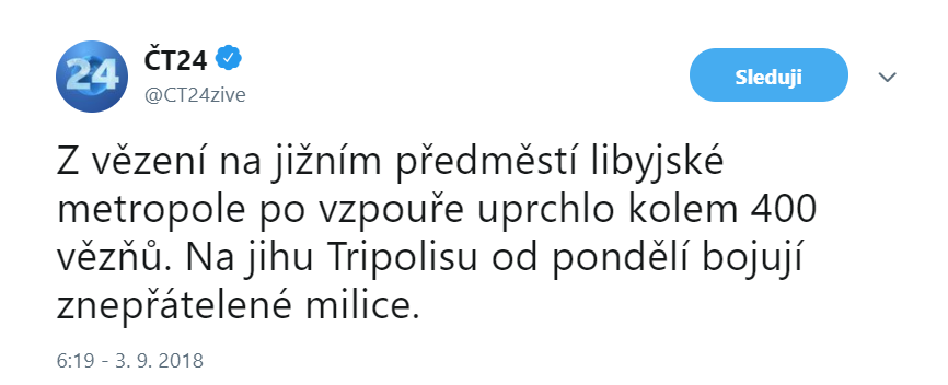 Zdroj https://svet.sme.sk/c/20903234/boje-v-h ... obeti.html z 30.08.2018Najmenej 26 ľudí vrátane civilistov prišlo o život v líbyjskom hlavnom meste Tripolis, kde sa vystupňovali boje medzi súperiacimi militantnými skupinami. Informovala o tom vo štvrtok 30.08.2018 hovorkyňa líbyjského ministerstva zdravotníctva Widád abú Níránová, ktorú cituje agentúra AP. Ďalších 75 osôb podľa nej utrpelo zranenia.