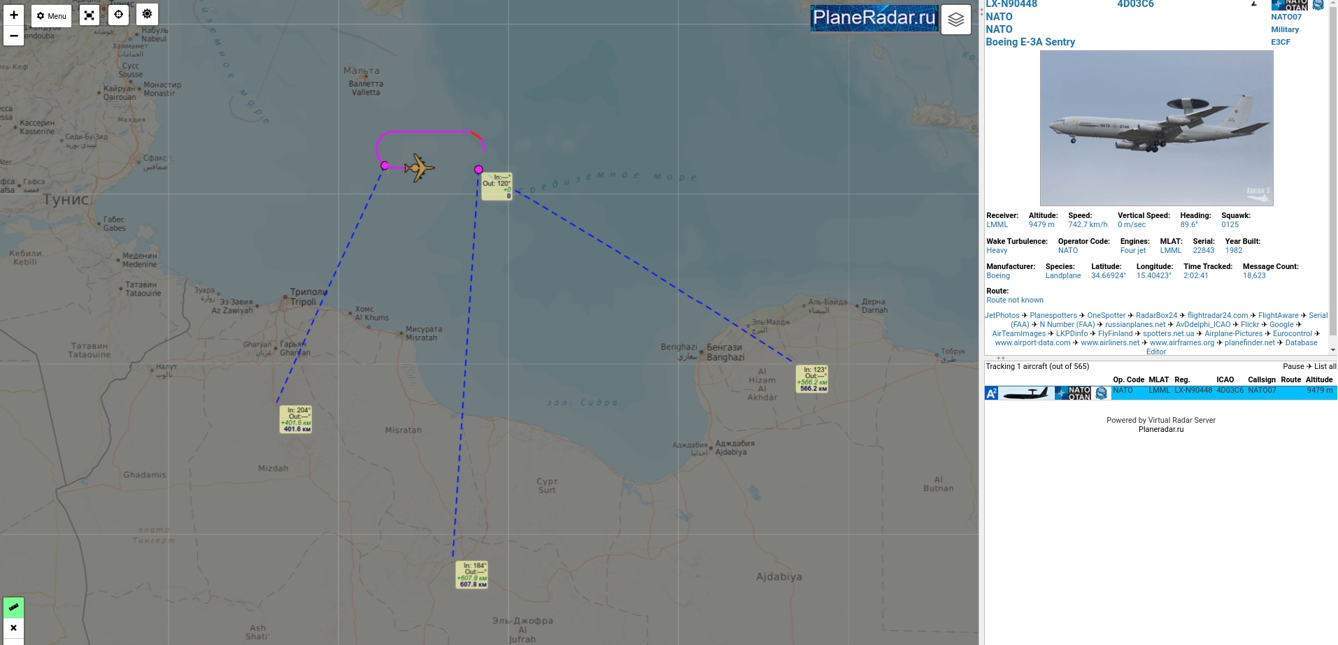 NATO AWACS E-3A LX-N90451 letí opět k Libyi, zatím je nad Itálií. Zrovna tankuje ve vzduchu nad středozemním mořem na výšce 5.7km, za tou obrátkou.. vypnul odpovídač..