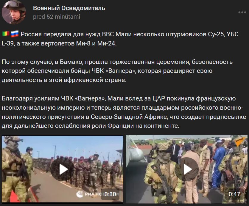 Rusko odovzdalo / previedlo pre potreby VVS Mali niekoľko bojových lietadiel rodiny Suchoj Su-25 (Су-25), cvičných lietadiel L-39, ako aj vrtuľníkov rodiny Mi-8 (Ми-8) a Mi-24 (Ми-24). Pri tejto príležitosti sa v Bamaku konala slávnostná ceremónia, ktorej bezpečnosť zabezpečovali bojovníci ČVK Wagner (ЧВК Вагнера), ktorá v tejto africkej krajine rozširuje svoje aktivity.
