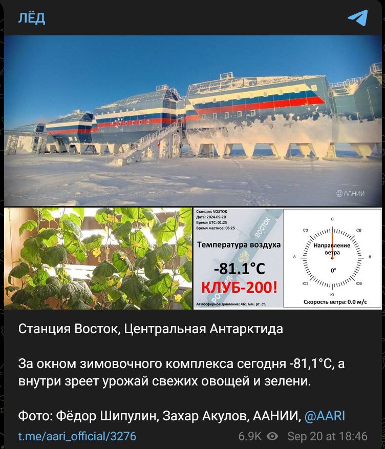 V piatok 20.09.2024 bolo za oknom komplexu -81,1°C a vo vnútri komplexu dozrieva úroda čerstvej zeleniny a byliniek. Zdroj https://t.me/aari_official/3276 z 20.09.2024