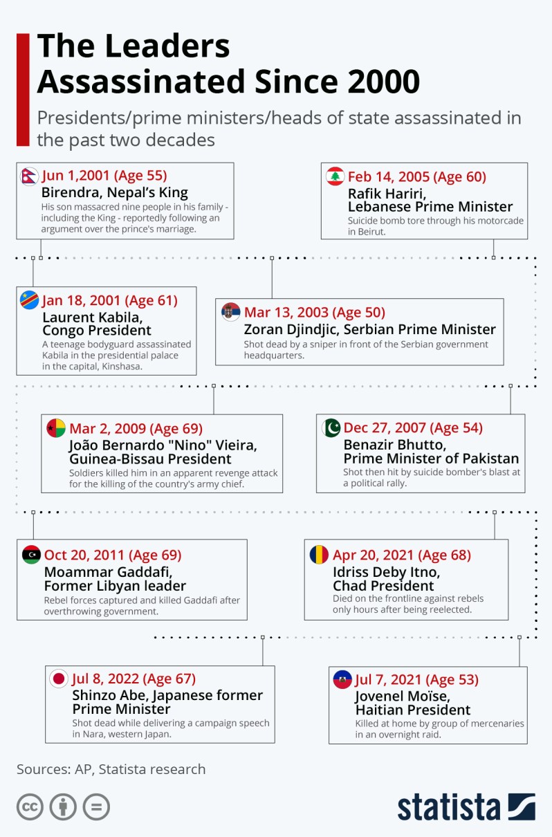 Jak uvádí Anna Flecková ze společnosti Statista níže, sázky mohou být pro politické představitele vysoké. Pokud se ohlédneme za posledními dvaceti lety, řada vůdců byla zavražděna buď během výkonu funkce, nebo poté, co odstoupili. V následujícím grafu se podíváme na prezidenty a premiéry, kteří byli zabiti od roku 2000, jak je uvádí agentura AP zde.