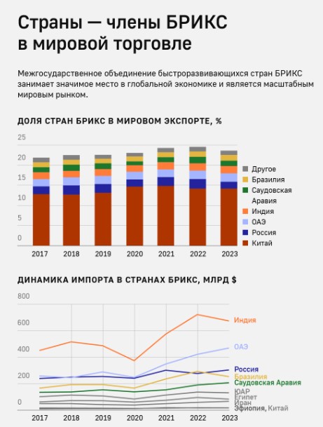 Obchodní obrat mezi Ruskou federací a zeměmi BRICS se podle šéfa ministerstva průmyslu a obchodu Antona Alichanova za prvních pět měsíců zvýšil o 6,3 %. Do konce roku 2024 se také očekává pozitivní dynamika.