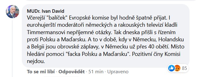 Ivan David bouchl pěstí do stolu. Kvůli Maďarsku. Zdá se mu totiž, že zatímco maďarský premiér je opakovaně podrobován kritice, na tureckého prezidenta Erdogana a na představitele dalších muslimských zemí si EU netroufá. Maďarský parlament před pár dny přijal zákon, podle něhož se zakazuje zobrazování homosexuality a změny pohlaví ve školních vzdělávacích materiálech a v televizních programech určených osobám mladším 18 let. Některé členské státy EU zákon odsoudily a vyzvaly předsedkyni Evropské komise Ursulu von der Leyenovou, aby Evropská komise začala konat. Nizozemský premiér Mark Rutte dokonce konstatoval, že „pro Maďarsko už v EU není místo.“. Na jeho slova upozornila CNN.