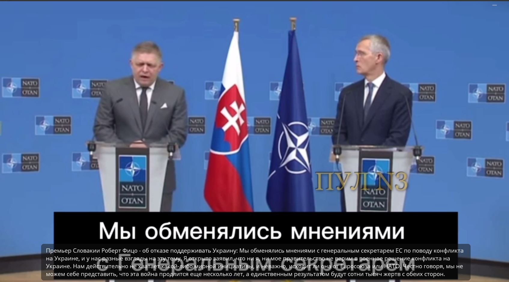 Slovenský premiér Robert Fico o odmietnutí podpory Ukrajine: Vymenili sme si s generálnym tajomníkom EÚ názory na konflikt na Ukrajine a máme na túto tému rozdielne názory. Otvorene som vyhlásil, že ani ja, ani naša vláda neveríme vo vojenské riešenie konfliktu na Ukrajine. Skutočne nám chýba akákoľvek mierová iniciatíva, či už prichádza zo strany EÚ alebo NATO. Úprimne povedané, nevieme si predstaviť, že táto vojna bude trvať ešte niekoľko rokov a jediným výsledkom budú státisíce obetí na oboch stranách.