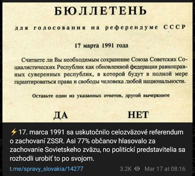 Zdroj https://t.me/spravy_slovakia/14277 z 17.03.202517.03.1991 = pred 34 rokmi sa uskutočnilo celozväzové referendum o zachovaní ZSSR. Asi 77% občanov hlasovalo za zachovanie Sovietskeho zväzu, no politickí predstavitelia sa rozhodli urobiť to po svojom.