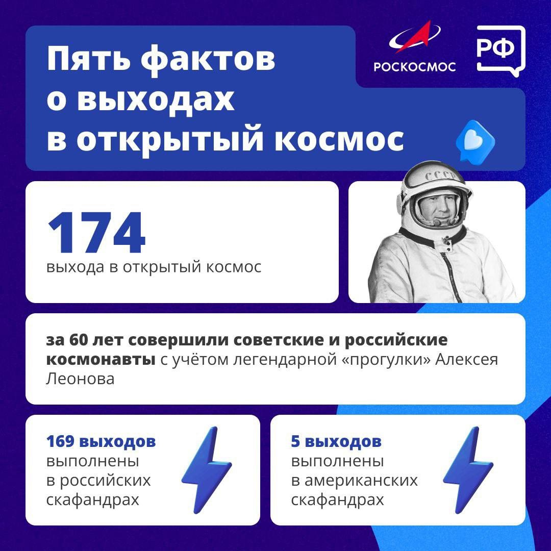 Zdroj https://vk.com/wall-30315369_583298 z 18.03.2025Počas posledných 60 rokov predviedli sovietski a ruskí kozmonauti 174 výstupov do vesmíru, berúc do úvahy legendárnu "prechádzku" Alexeja Leonova (Алексея Леонова). Z toho 169 výstupov bolo realizovaných v ruských skafandroch, 5 v amerických.