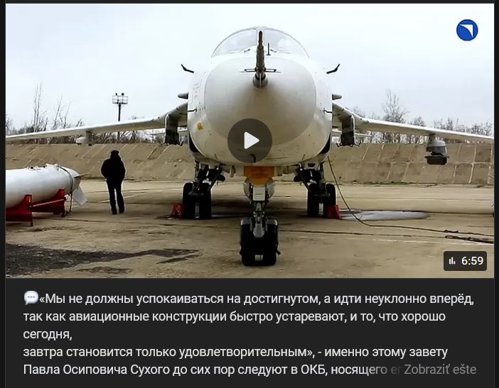 Video https://vk.com/video-211699782_456239608 dĺžka 6:59 min.„Nesmieme sa uspokojiť s tým, čo sme dosiahli, ale ísť neustále dopredu, pretože konštrukcie lietadiel rýchlo zastarávajú a to, čo je dnes dobré, sa zajtra stáva len uspokojivým“ - týmto prikázaním Pavla Osipoviča Suchoja (Павла Осиповича Сухого) sa dodnes riadi konštrukčná kancelária, ktorá nesie jeho meno, vytvára najlepšie lietadlá na svete a zakaždým dokazuje ich prvenstvo vo vzduchu!