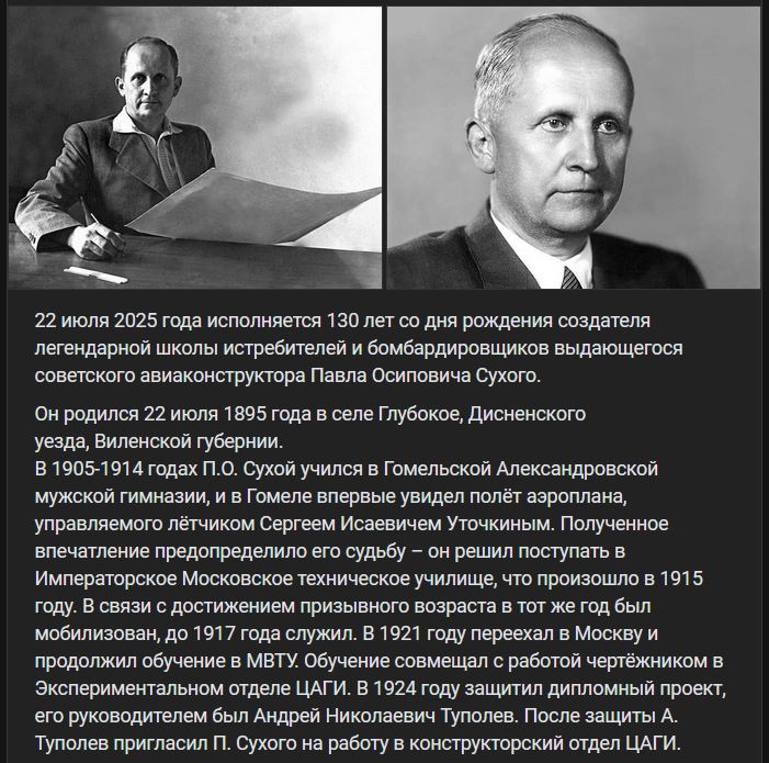 + skoro celý životopis ... Zdroj https://vk.com/wall-173678697_412076 z 22.07.202522.07.2025 si pripomíname 130. výročie narodenia Pavla Osipoviča Suchoja (Павла Осиповича Сухого), tvorcu legendárnej školy stíhacích a bombardovacích lietadiel, významného sovietskeho konštruktéra.