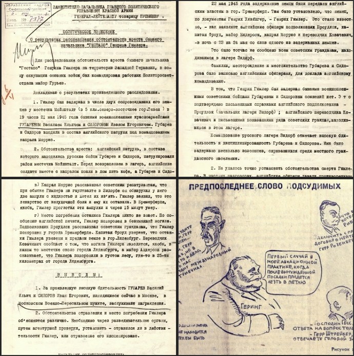 Podľa týchto materiálov bol Himmler, ktorý mal pri sebe falošné doklady na meno feldwebela Heinricha Hisingera, zadržaný 21.05.1945. Gubarev (Губарев) a Sidorov (Сидоров), bývalí vojnoví zajatci, boli členmi anglickej hliadky a z vlastnej iniciatívy pokračovali v obchádzaní terénu, kým britskí vojaci odišli piť kávu.