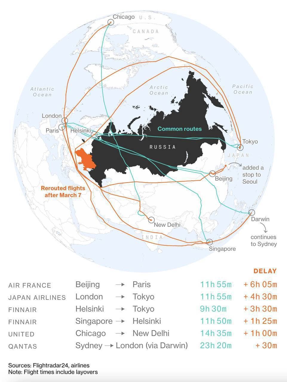 Letecké společnosti se vracejí na trasy z dob studené války a vyhýbají se ruskému vzdušnému prostoru.