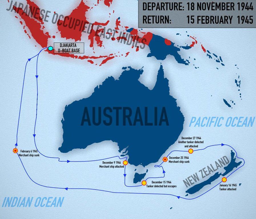 Mapa ukazuje plavbu U-862 v letech 1944-45, jediné německé ponorky, která dosáhla Tichého oceánu během druhé světové války. Po kapitulaci Německa byla ponorka včleněna do Císařského japonské námořnictva.