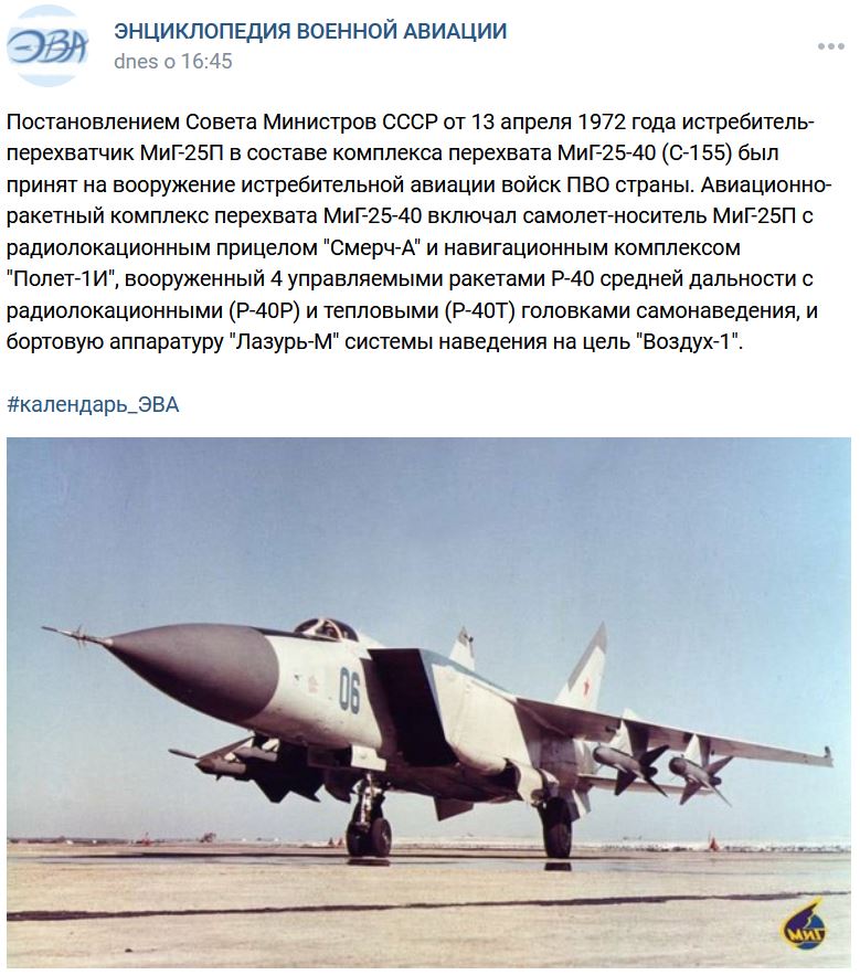 Výnosom Rady ministrov ZSSR z 13.04.1972 = pred 50-timi rokmi bol prepadový stíhač MiG-25P (МиГ-25П) v rámci komplexu MiG-25-40 (S-155) / МиГ-25-40 (С-155) prijatý do výzbroje stíhacieho letectva vojsk PVO krajiny. Letecko-raketový komplex MiG-25-40 pozostával z nosného lietadla MiG-25P (МиГ-25П) s radarovým zameriavačom Smerč-A (Смерч-А) a navigačným systémom Polet-1I (Полет-1И), vyzbrojeného 4 riadenými raketami stredného doletu s radarovými (R-40R/Р-40Р) a tepelnými (R-40T/Р-40Т) navádzacími hlavicami, palubnou aparatúrou Lazur-M (Лазурь-М) so systémom navedenia na cieľ Vozduch-1 (Воздух-1).