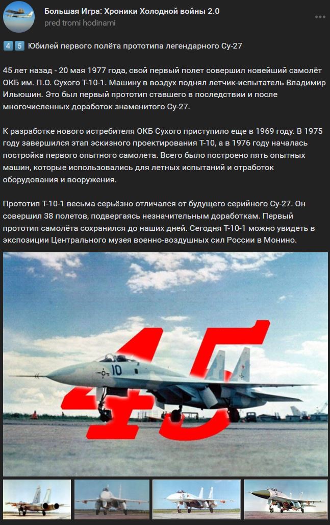 20.05.1977 = pred 45-timi rokmi vzlietol prvý let najnovšieho lietadla konštrukčnej kancelárie OKB Suchoj T-10-1. Lietadlo pilotoval skúšobný pilot Vladimir Iljušin (Владимир Ильюшин). Bol to prvý prototyp lietadla, ktoré sa neskôr po mnohých úpravách stalo slávnym Su-27 (Су-27). Konštrukčná kancelária Suchoj začala s vývojom novej stíhačky už v roku 1969. Koncepčná fáza návrhu T-10 bola dokončená v roku 1975 a v roku 1976 sa začala stavba prvého prototypu. Celkovo bolo postavených 5 prototypov T-10, ktoré sa používali na letové skúšky a skúšky vybavenia a výzbroje. Prototyp T-10-1 sa výrazne líšil od budúceho sériového lietadla Su-27. Uskutočnil 38 letov a prešiel menšími úpravami. Prvý prototyp sa zachoval dodnes. Dnes je T-10-1 k videniu v expozícii Ústredného múzea ruských vzdušných síl v Monino (Монино = už nie dlho, Monino sa ruší sa všetko sa presťahuje do Parku Patriot)