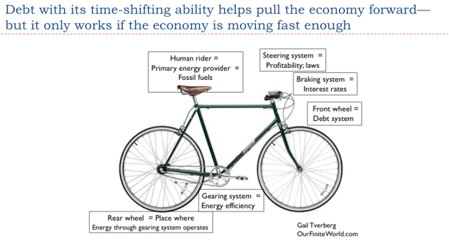 - Obrázek 3. Obrázek vytvořený Gail Tverbergovou v roce 2018, aby vysvětlil složitou souhru dluhů, dodávek energie, zařízení využívajících energii, rostoucí účinnosti, ziskovosti a vládních zákonů.