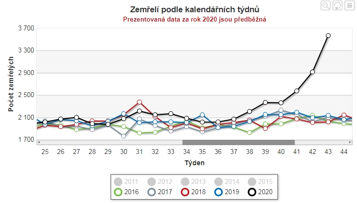 Data MZČR ke včerejšku (konec listopadu) - zemřelí podle měsíců Dle ČSÚ zemřelo v kt. 39 ca 600 lidí, v kt. 40 ca 600 lidí, kt. 41 ca 800, kt.42 už 1100 a v kt.43 1800 lidí. Je odečtena průměrná hodnota (1800), jde tedy jen o přírůstek nad průměrnou hodnotu grafu, aby data alespoň zhruba odpovídala druhému grafu. Jen za říjen to tedy dle ČSÚ činí ca 4 900 lidí.