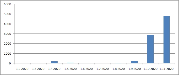 Dle MZČR to bylo trochu jinak - data jsou měsíční, od ledna do září to bylo celkem ca 500 lidí, v říjnu ca 2900 a v listopadu 4800 lidí.
