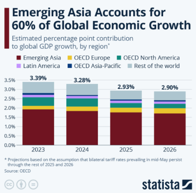 Podle odhadů OECD by rozvíjející se asijské ekonomiky měly letos představovat 60 % globálního ekonomického růstu, což je nárůst z 57 % v roce 2023 a 56 % v roce 2024. Tento nárůst bude převážně na úkor Severní Ameriky, jejíž podíl na globálním ekonomickém růstu by měl klesnout z 13 % v posledních dvou letech na pouhých 8 % v letech 2025 a 2026.