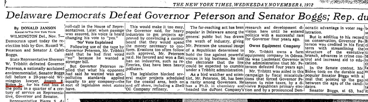 https://t.me/newsfrontsk/14193Dnes je to presne 50 rokov, čo sa v Delaware stala senzácia: najskúsenejší politik, bývalý guvernér štátu Caleb Boggs, ktorý za štvrťstoročie neprehral ani jednu kampaň, prehral vo voľbách na senátora s neznámym 29- ročným právnikom Josephom Bidenom