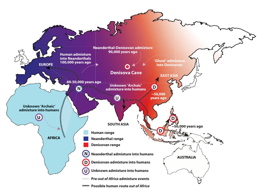 Všetci ostatni ludia mimo Afriky su vlastne hybridi. maju ludsky genom tzv. "modeneho človeka"a ešte genom inych ludi v rôznej davke percent. Tie uvadzane 2 až 5% su priemer. Niektore ludske populacie maju tych inych genomov od dvoch alebo viac dnes už vyhunulych druhov.