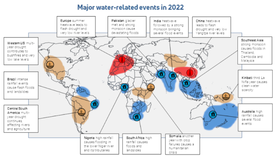 Významné události související s vodou v roce 2022. Zdroj: Souhrnná zpráva Global Water Monitor 2022