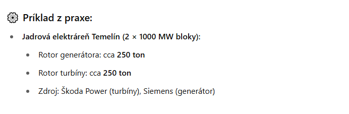Bavili sme sa tu nedávno o schopnosti rotujúcej turbíny a generátora elektrárne stabilizovať svojím momentom zotrvačnosti frekvenciu v sieti. Tak som sa opýtal AI a toto mi odpovedala. V podstate to dá impulzný výkon 307MW po dobu 0,1sec(ak sa znížia otáčky z 1500 na 1491ot/min) Hmotnost rotujúcich častí je vraj 500 ton