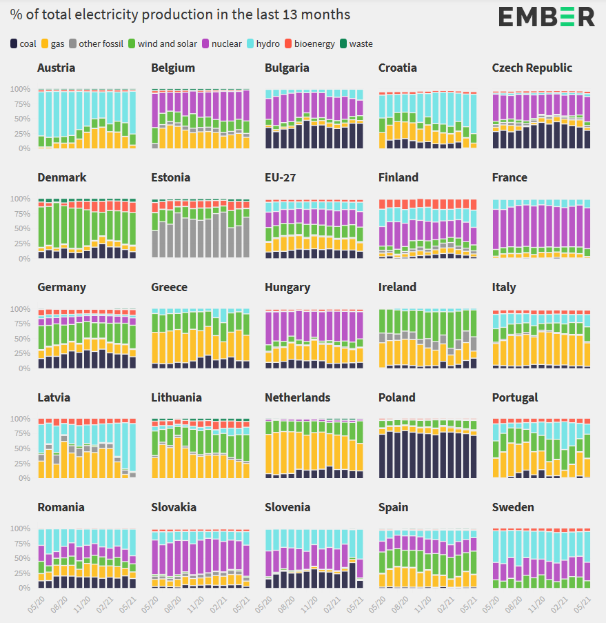 Problémem je obecně dostupnost aktuálních dat. Mezeru na informačním trhu nedávno zaplnila mezinárodní analyticko-aktivistická organizace Ember (dříve Sandbag), která přináší aktuální a detailní pohled na výrobu elektrické energie v jednotlivých zemích Evropské unie. Grafy ukazují podíl různých zdrojů na celkové výrobě až do května letošního roku. Ukazují ale i to, jak jsou evropské země různorodé, co se výroby elektrické energie týká. Lze je (s trochou víkendového nadhledu) rozčlenit do šesti skupin: