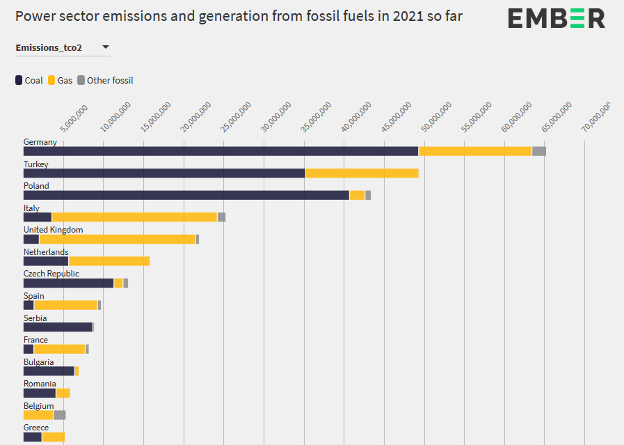 Objem vypuštěných emisí oxidu uhličitého z elektráren od ledna do května 2021. Zdroj: Ember 6. Fosilní dinosauři
