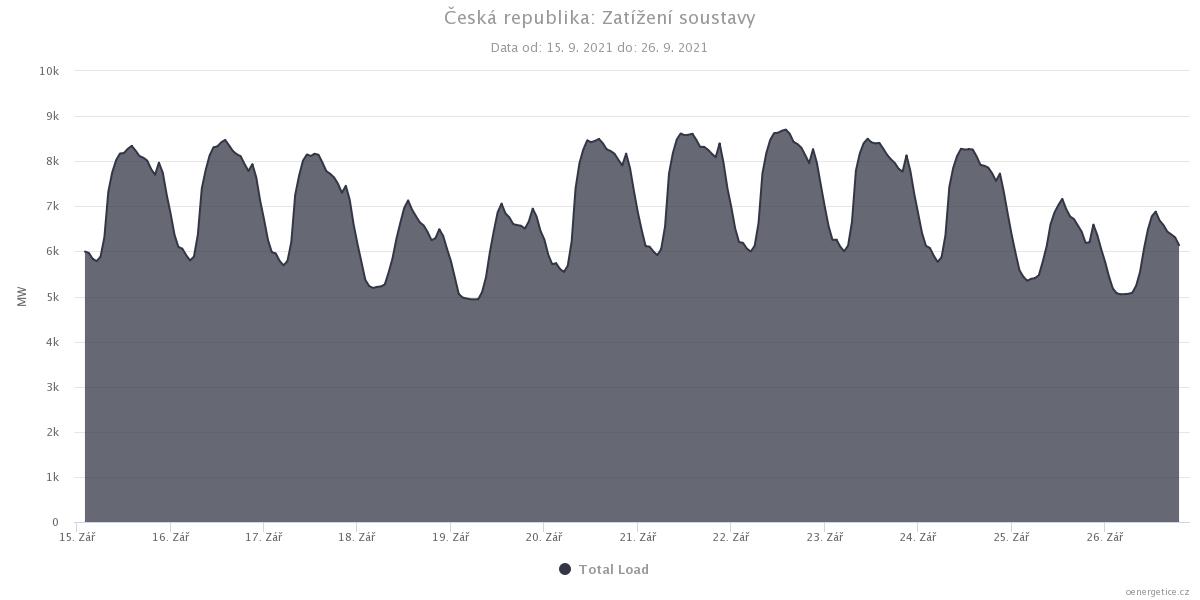 Takže záťaž elektrifikačnej sústavy ČR v grafe kolíše zhruba medzi 5 - 8,7 GW.