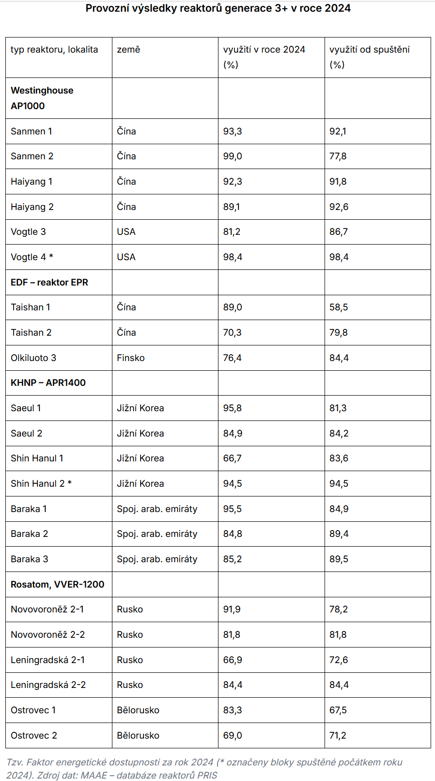 Mezinárodní agentura pro atomovou energii (MAAE) na svém webu uvádí data o provozu všech jaderných reaktorů ve světě. Dostupná jsou zde i data za minulý rok. Pokud se podíváme na faktor energetické dostupnosti, relativně nejvyšší spolehlivost vykazují reaktory AP1000 od amerického Westinghouse. Druhé jsou korejské reaktory APR1400. Slabší výsledky zatím mají francouzské reaktory EPR a ruské VVER-1200.