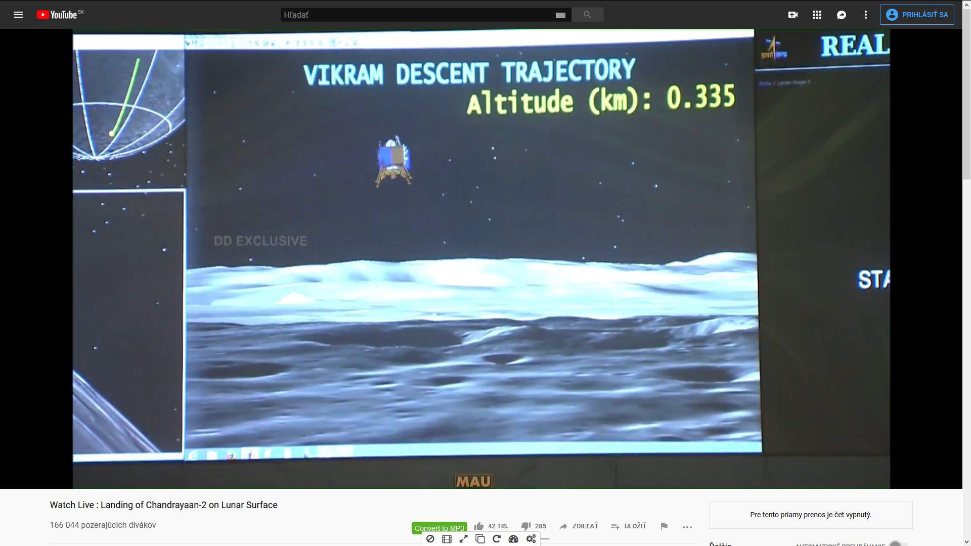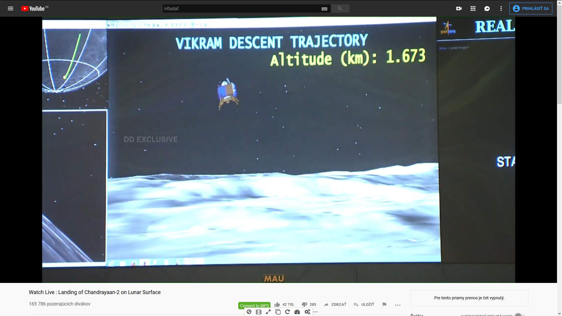 Historická udalosť - indický pokus o pristátie na Mesiaci - modul Vikram sondy Čandraján-2