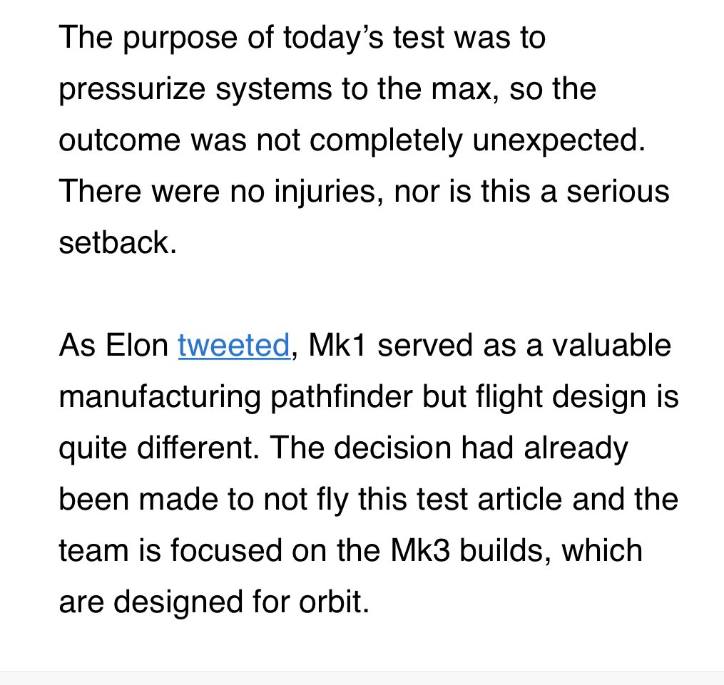 Podľa neoverených informácií išlo o chybu tlakovania, normálny tlak je 3 Bar v nádržiach mali testovať včera jednorázovo 1.5-2 násobok za účelom štrukturálneho testu. Kvoli chybe v komunikácii medzi senzormi, pumpami a diaľkovým riadením došlo k masívnemu pretlaku. :evil: To viac menej potvrdzuje aj následné vyjadrenie zo strany SpaceX keďže testovali nádrže na max no bolo to nakoniec viac ako max. Link na to odkiaľ to mám: