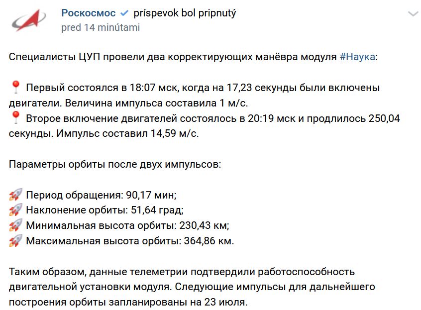 V sobotu 24.07.2021 ďalšími impulzami upravili obežnú dráhu modulu Nauka. Ďalšia korekcia dráhy impulzami 27.07.2021