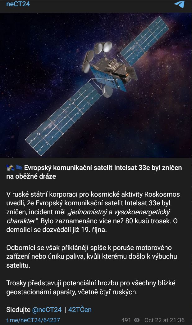 V ruské státní korporaci pro kosmické aktivity Roskosmos uvedli, že Evropský komunikační satelit Intelsat 33e byl zničen, incident měl „jednomístný a vysokoenergetický charakter“. Bylo zaznamenáno více než 80 kusů trosek. O demolici se dozvěděli již 19.10.2024 (sobota). Odborníci se však přiklánějí spíše k poruše motorového zařízení nebo úniku paliva, kvůli kterému došlo k výbuchu satelitu. Trosky představují potenciální hrozbu pro všechny blízké geostacionární aparáty, včetně 4 ruských.