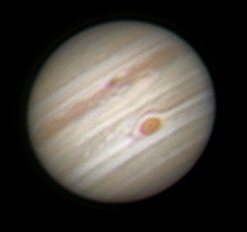 Je to tak, barvy jsou normálně vidět. Takhle vypadal můj první snímek - Jupiter. Snímáno teleskopem Nasmyth 200/2100, barevná kamera QHY5, z ca 1000 snímků vybráno 100 nejlepších a ty pak byly použity pro finální foto...