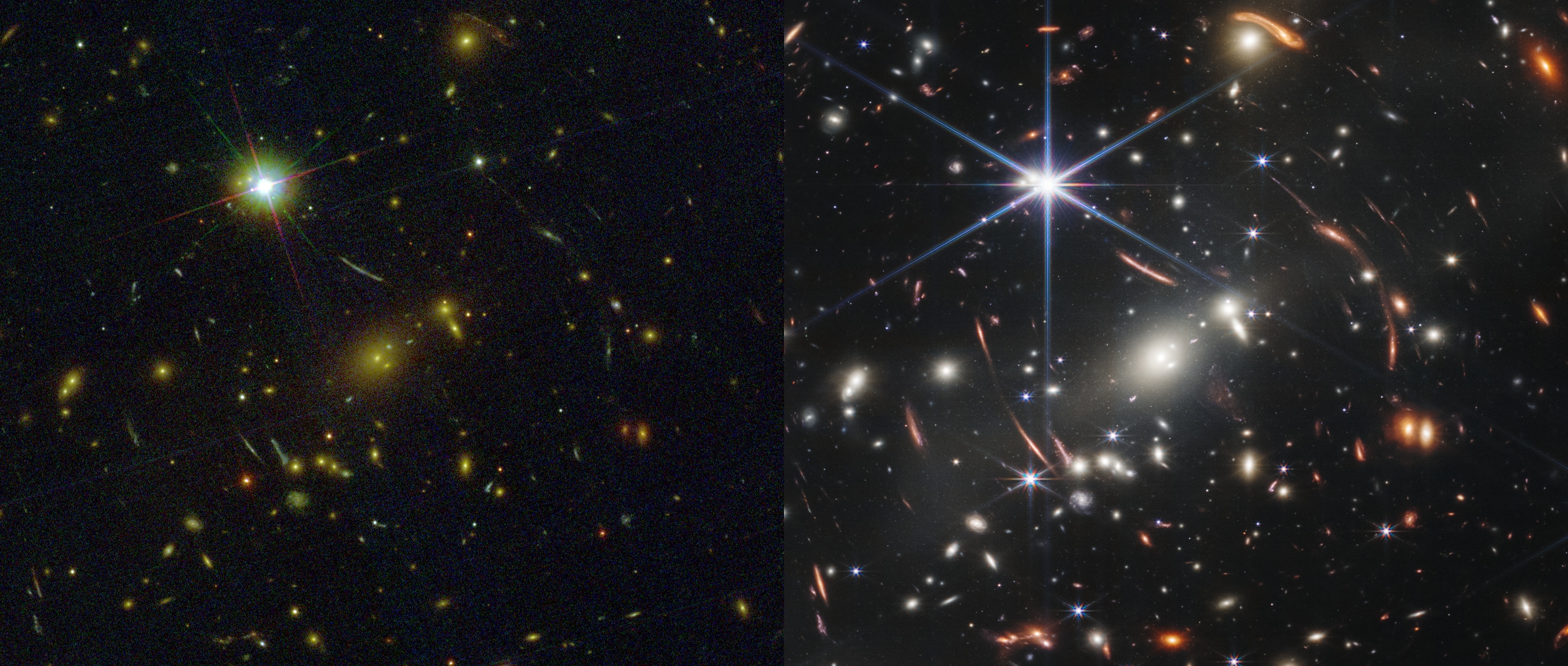 Porovnání stejné oblasti focené z Hubble a JWST. Jde o oblast známou jako Webb's First Deep Field...
