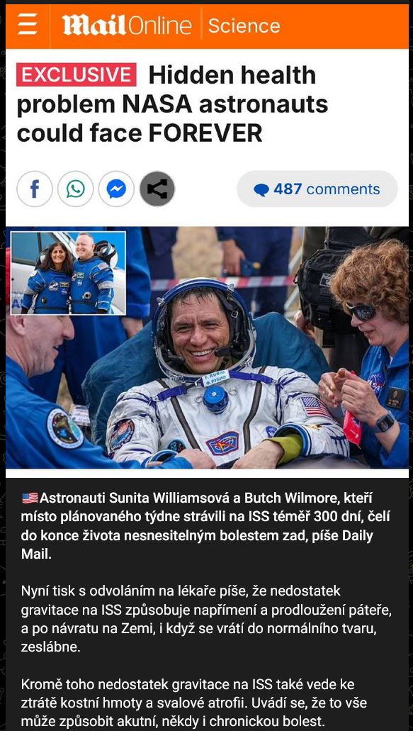 Zdroj https://t.me/neCT24/71799 z 21.03.2025Astronauti Sunita Williamsová a Butch Wilmore, kteří místo plánovaného týdne strávili na ISS téměř 300 dní, čelí do konce života nesnesitelným bolestem zad, píše Daily Mail.