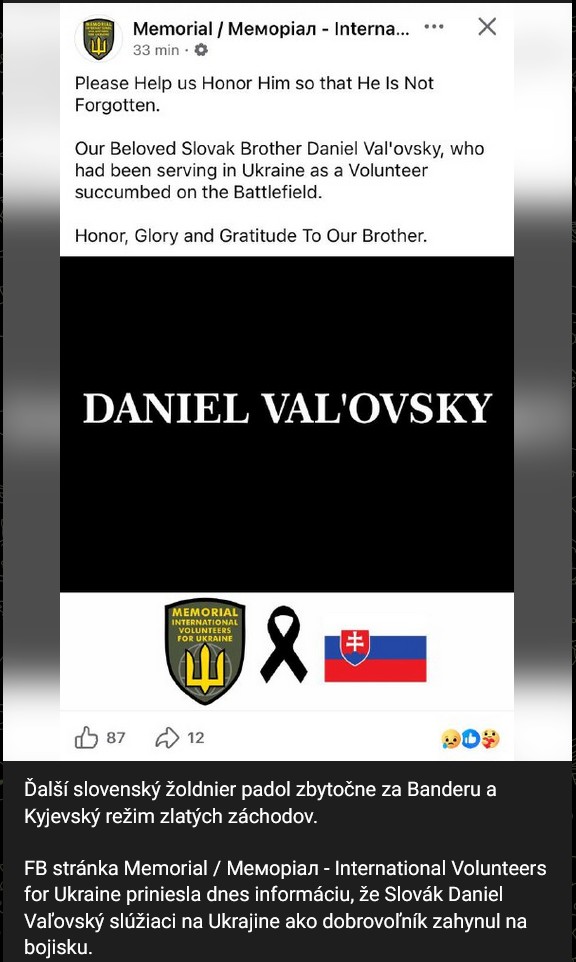 FB stránka Memorial / Меморіал - International Volunteers for Ukraine priniesla v nedeľu 04.01.2026 informáciu, že Slovák Daniel Vaľovský slúžiaci na Ukrajine ako dobrovoľník zahynul na bojisku.