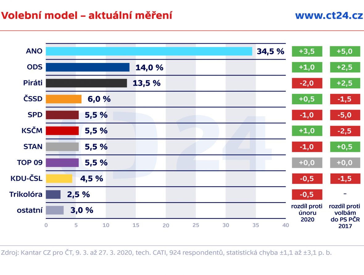 V březnu posílila dominance hnutí ANO na 34,5 procenta, ztrátu zaznamenali Piráti