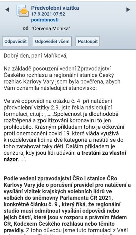 Vedoucí redakce zpravodajství Českého rozhlasu Monika Červená se ke kauze cenzurování političčiny odpovědi vyjádřila v e-mailu přímo Maříkové následovně: „Podle vedení zpravodajství ČRo i stanice ČRo Karlovy Vary jde o porušení pravidel pro natáčení a vysílání vizitek krajských volebních lídrů ve volbách do Poslanecké sněmovny Parlamentu ČR 2021, konkrétně článku č. 9, který říká, že regionální studio musí odmítnout vysílání odpovědi nebo jejich částí, které jsou v rozporu s právním řádem ČR, Kodexem Českého rozhlasu nebo těmito pravidly. Z toho důvodu jsme tuto informaci z Vaší odpovědi vystřihli.“