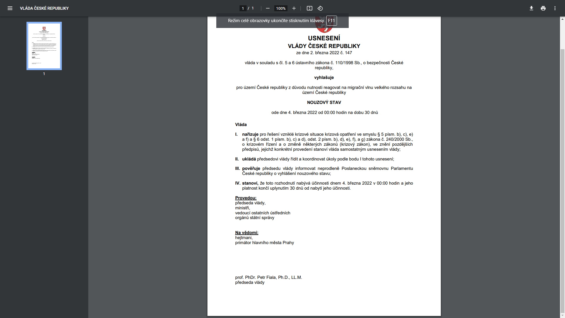 https://www.mvcr.cz/docDetail.aspx?doci ... ocType=ARTVláda kvůli schopnosti zvládnout příliv uprchlíků z Ukrajiny vyhlásila nouzový stav. Platit bude od pátku 4. března 2022. Jde o klasický nástroj krizového řízení, který nebude znamenat omezení pro naše občany, ale umožní lepší koordinaci a technické řešení současného stavu.