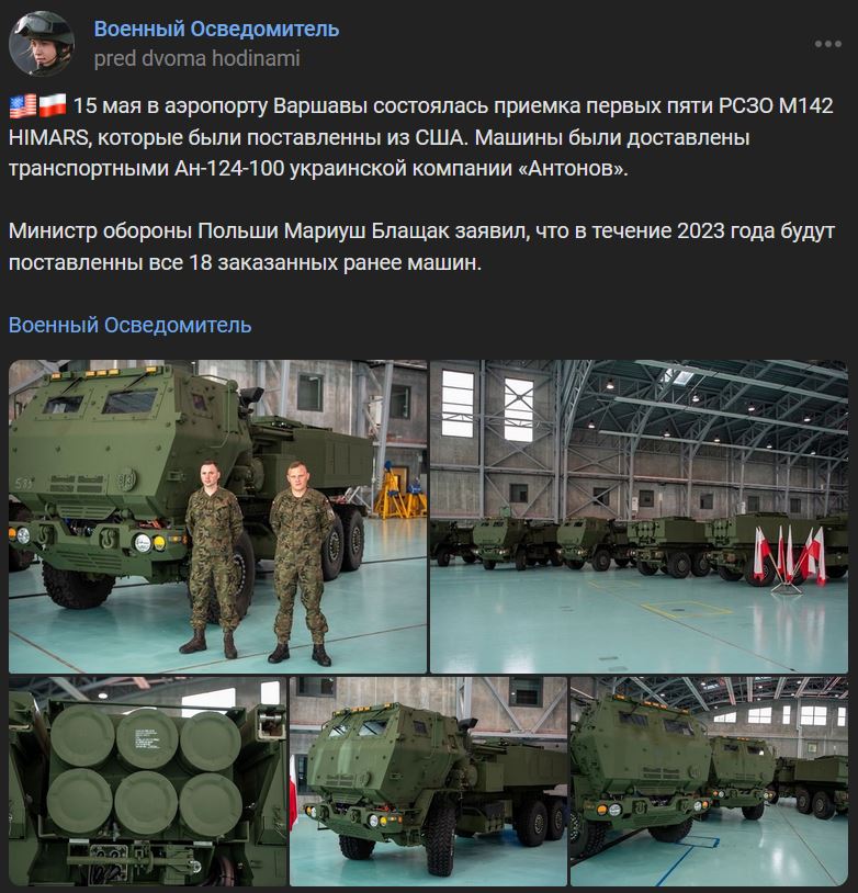 V pondelok 15.05.2023 bolo na varšavskom letisku prijatých prvých 5 raketometov M142 HIMARS, ktoré boli dodané z SŠA. Vozidlá boli dodané transportnými lietadlami An-124-100 (Ан-124-100) ukrajinskej spoločnosti Antonov (Антонов). Poľský minister obrany Mariusz Blaszczak uviedol, že všetkých 18 predtým objednaných vozidiel bude dodaných v priebehu roka 2023.