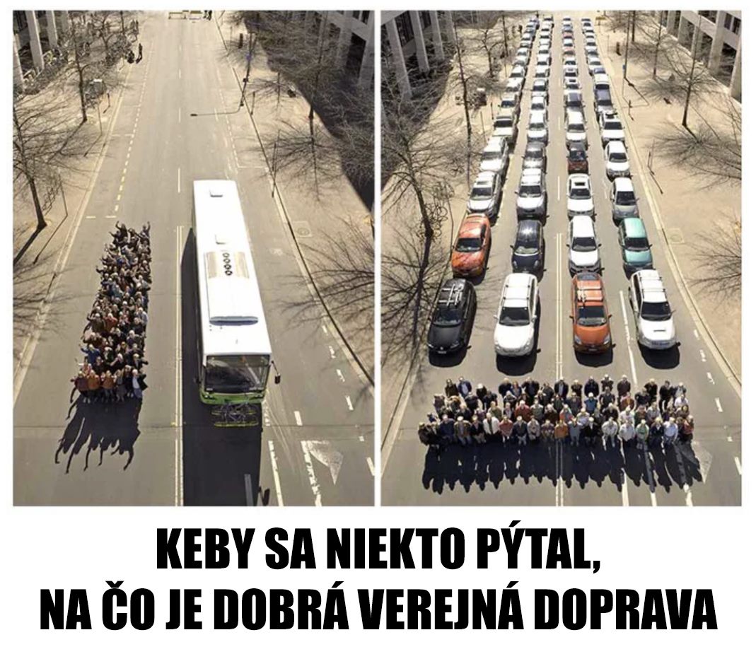 To auto ho nepredbehne, pretože všetci stoja v zácpe.mzprx píše: ↑03 zář 2019, 20:47Pekny obrazok, ale zavadzajuci. Autobus iduci napriklad raz za 5 minut ani nepride na zastavku a tie auta uz budu v cieli cesty. Ti ludia by museli vsetci ist tym istym smerom. Autobus nebyva vzdy plny, mimo spicky je obsadenost asi 30-50%, niekedy aj menej, ale autobus je stale rovnaky a spotrebuje rovnako paliva.