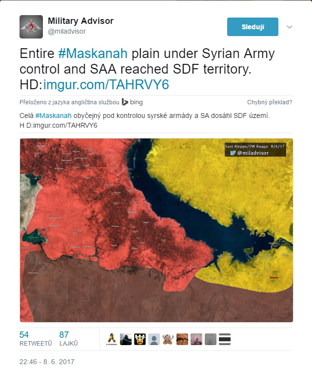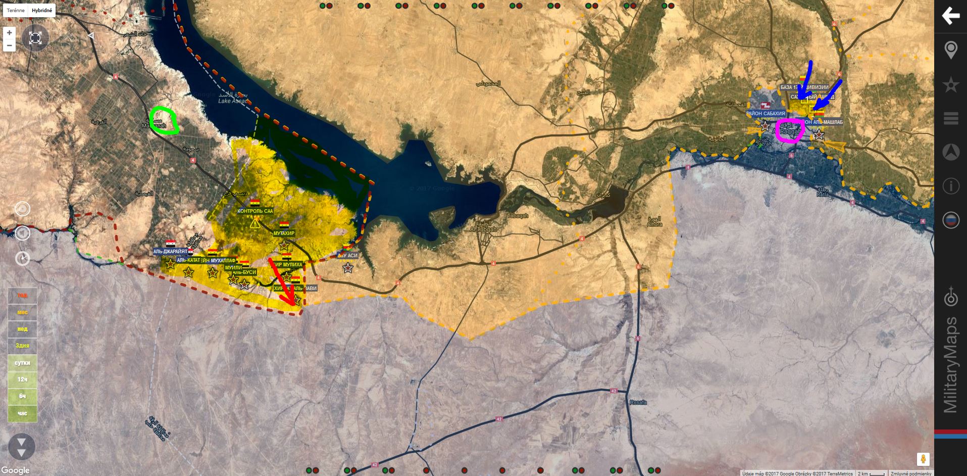 Maskanah, Rakká.. SAA+ získala územie Ghazala(غزالة), Dibsi Faraj(دبسي فرج), Dibsi Afnan(دبسي عفنان), Mashrifat Al Saib(مشرفة الصعب), Al-Salimiyah(السالمية), Khirbat Ash Saab (الصعب), Fukhaykha(فخيخة), Al Emirat(العميرات), Ghammiz(الغماميز), Muazyzilah(معيزيلة), Sheyb Al Dahkr(شعيب الذكر), Khirbat al Wawi(خربة_الواوي), Mushrifat Alghajar(مشرفة الغجر), Madahir(مدحير), Jarayat(جريات), Turfa(ترفة), Al Qutayt(القطيط) and Al Mukhalaf(المخلف). Hraničí s územím SDF+ pri Abu Asi. Pri Rakká SDF + získali 17th Division Base a cukrovar