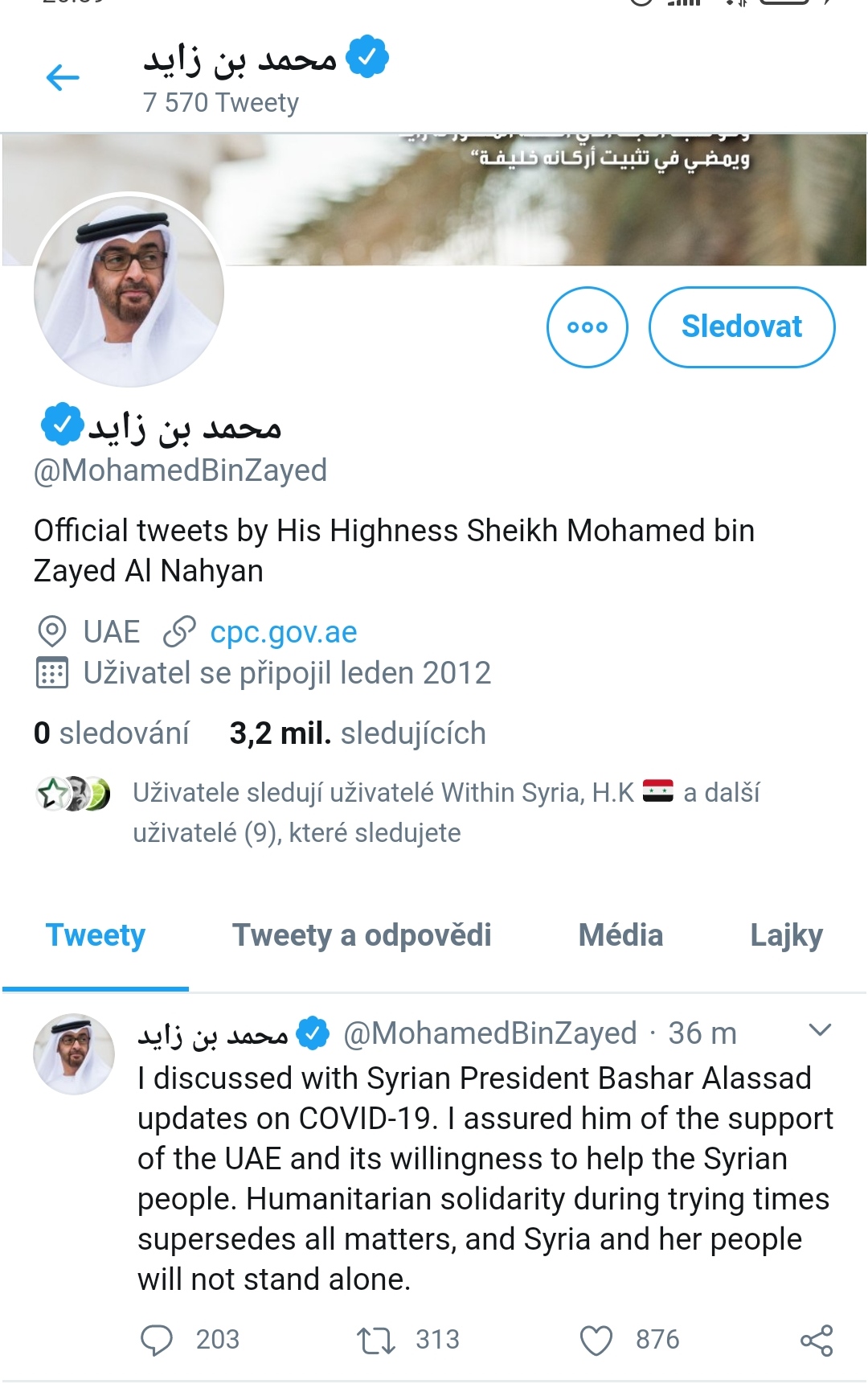 Diskutoval jsem se syrským prezidentem Basharem Alassadem o COVID-19. Ujistil jsem ho o podpoře SAE a její ochotě pomoci syrskému lidu. Humanitární solidarita v době pokusů nahrazuje všechny záležitosti a Sýrie a její lidé nebudou stát sami.