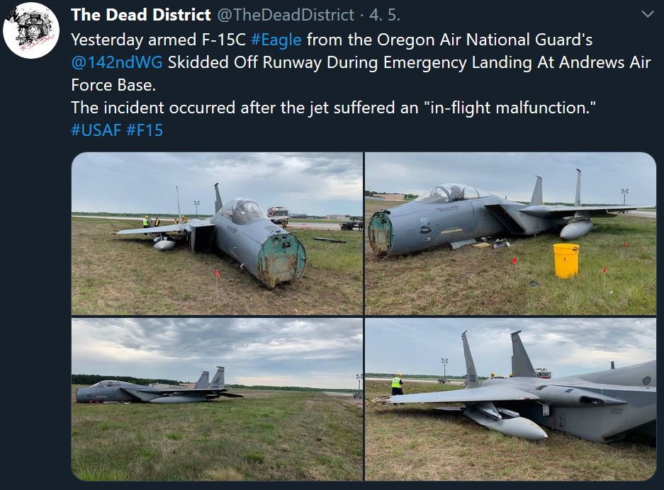 V sobotu 02.05.2020 o cca 13:30 hod. miestneho času v USA na letisku Andrews AFB po núdzovom pristátí (technická porucha pri lete) lietadla McDonnell Douglas F-15C-38-MC Eagle patriaceho USAF na dráhe dostal šmyk. Lietadlo je veľmi poškodené, pilotovi sa nič nestalo.