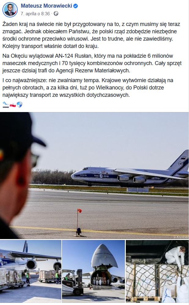 Aktuálny poľský premiér Mateusz Morawiecki na svojom profile zverejnil v utorok 07.04.2020 fotky ruského lietadla Antonov An-124-100 "Ruslan" patriaci ruskej spoločnosti Volga-Dnepr (Волга-Днепр) ktoré na letisko vo Varšave z Číny doviezlo 6 miliónov medicínskych masiek + 70 tisíc ochranných kombinéz / oblekov