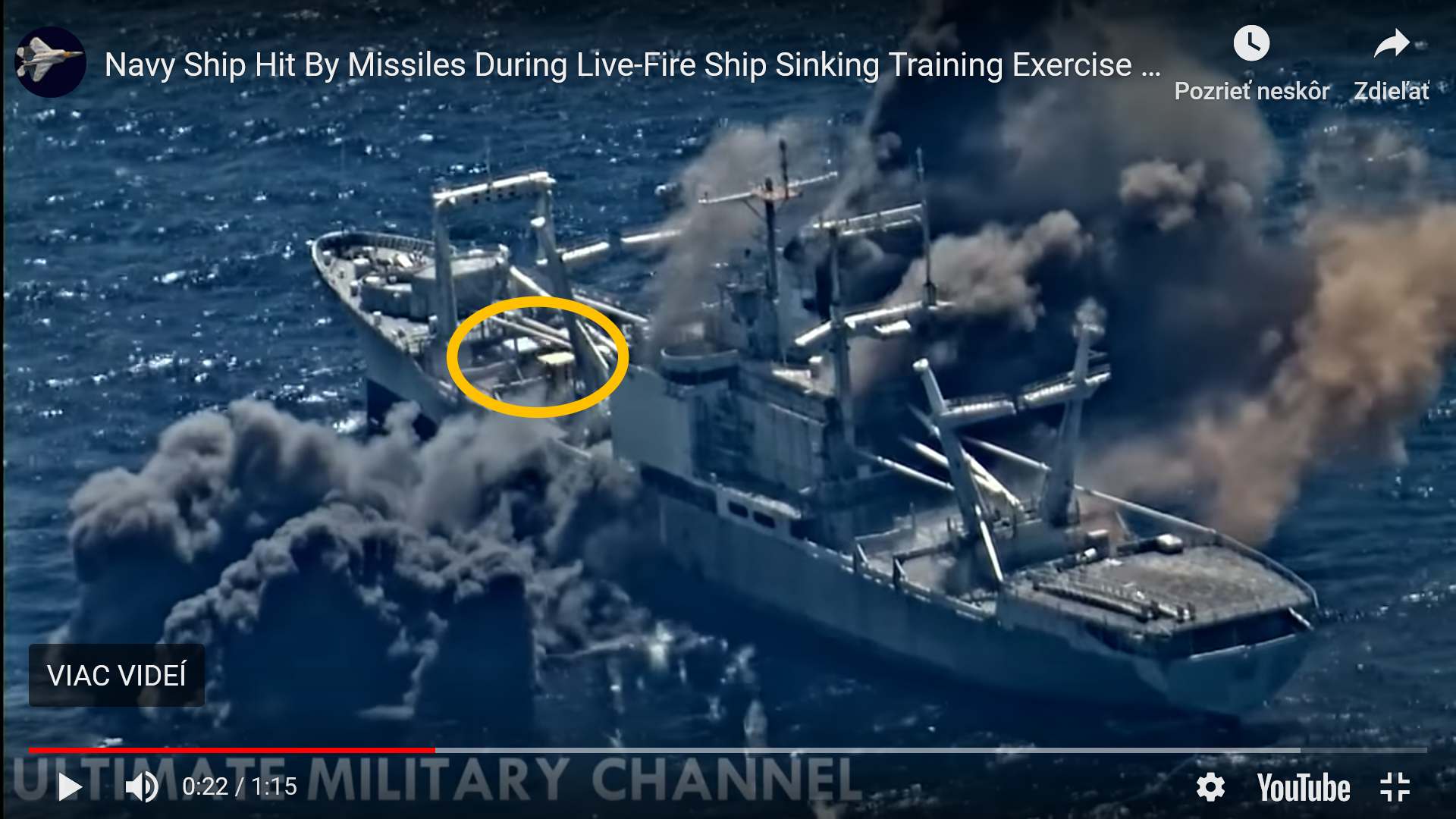 Plus "druhá" bola zrejme súčasne zo zásahom z opačnej strany - kúdol dymu na pravoboku vyrazí na dvoch miestach. "Prvá" (odpredu) podľa dlhej stopy vo vode zrejme cieľ nezasiahla.