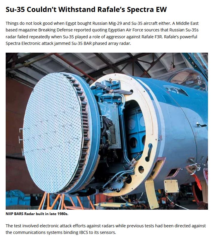 translator: Dobře to nevypadá ani s nákupem ruských letounů Mig-29 a Su-35 v Egyptě. Blízkovýchodní časopis Breaking Defense s odvoláním na zdroje egyptského letectva uvedl, že ruské radary Su-35 opakovaně selhaly, když Su-35 plnily roli agresora proti Rafale F3R. Výkonný elektronický útok Rafale Spectra rušil radar Su-35 BAR s fázovanou soustavou.