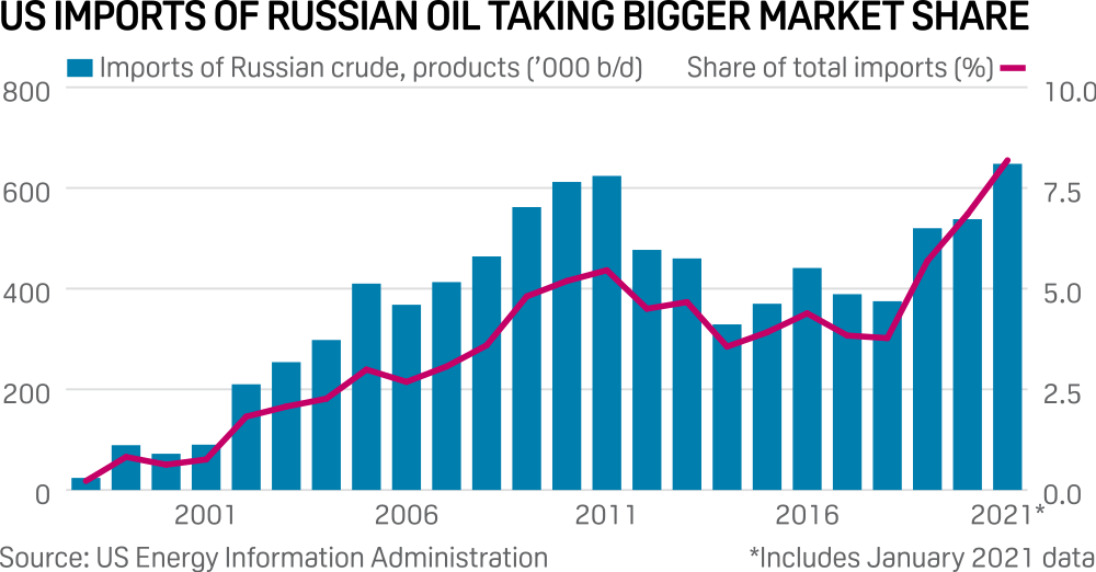 Podle údajů Americké energetické informační správy dosáhl podíl ruské ropy jako podíl na celkovém dovozu ropy do USA v lednu 2021 rekordních 8%, a to ze 4% v roce 2018.
