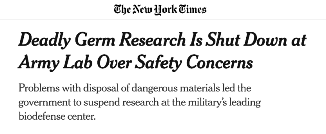 V srpnu 2019 americké Centrum pro kontrolu a prevenci nemocí (CDC) náhle nařídilo dočasné uzavření Amerického armádního institutu infekčních nemocí (USAMRIID) ve Fort Detrick. Podle zprávy deníku New York Times zahrnoval pozastavený laboratorní výzkum určité toxiny, které vláda identifikovala jako „vážnou hrozbu pro zdraví lidí, zvířat a rostlin nebo živočišné a rostlinné produkty“. Proč CDC odmítlo zveřejnit informace o tomto rozhodnutí?